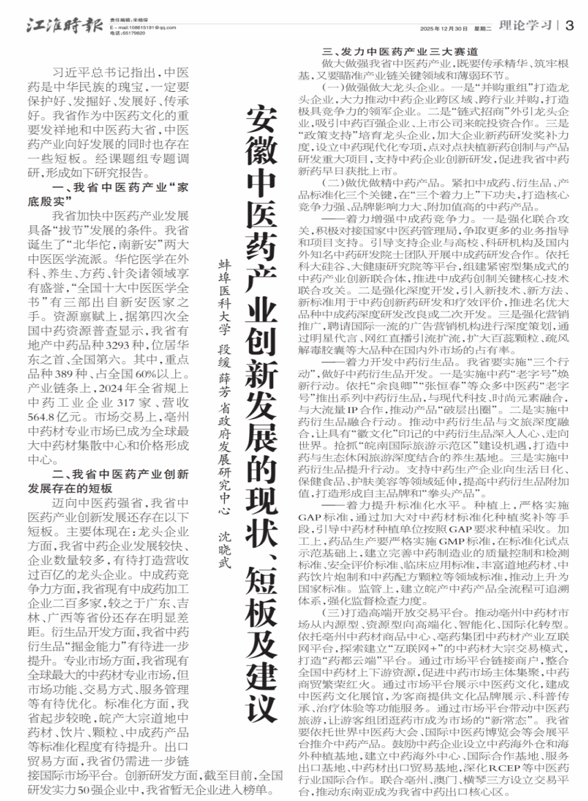 近日,我校英国上市公司365段缓团队撰写的咨政报告《安徽中医药产业创新发展的现状、短板及建议》在省级主流理论与决策咨询媒体《江淮时报》刊发,并被相关决策部门采纳。该报告以作者署名形式发表,署名单位包括安徽省人民政府发展研究中心,体现了我校在健康与中医药政策研究领域的积极参与和智库作用。